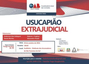 Palestra: USUCAPIÃO EXTRAJUDICIALData: 28 de outubro de 2016Local: Auditório – Sindicato dos Arrumadores de São Francisco do SulInscrições: e-mail 2tabelionatosfsul@gmail.com ou pelo
